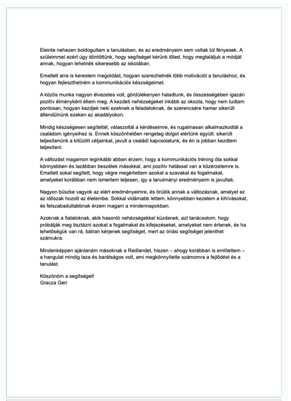 A Redland módszertana segítette abban, hogy 7 hónap alatt két tanév anyagát dolgozza fel, és felkészüljön egy olyan kihívásra, amire mások éveket szánnak: sikeres érettségit tett, két emelt szintű vizsgát teljesített, és bejutott a fogorvosi egyetemre – oda, ahol az egyik legmagasabb felvételi ponthatár volt. Ez nemcsak tananyag, hanem valódi cél és küzdelem volt – amit közösen elértünk.